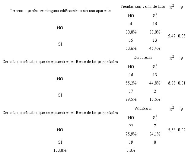 Al relacionar la subescala características físicas de la escala de territorialidad y la subescala características físicas de la escala de rutina de actividad se halló una relación entre los ítems “terreno o predio sin ninguna edificación o sin uso aparente” y “cercados o arbustos que se encuentren en frente de las propiedades” de la escala de territorialidad y “tiendas con venta de licor, discotecas y whiskería”, características físicas de la rutina de la actividad, encontrándose que en los escenarios donde se ha presentado el homicidio se hallan sitios de expendio de licor y medios que dificultan enterarse de la presencia de extraños (ver la tabla 5. Ver X2: Chi-cuadrado).