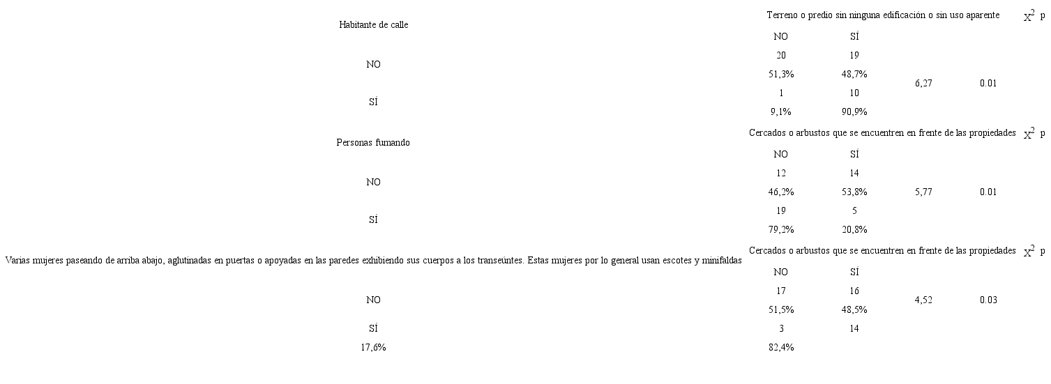 Las tablas 6 y 7 presentan las subescalas de las características sociales de la escala de desorden, cuyas asociaciones resultaron estadísticamente significativas con las subescalas de las demás escalas (territorialidad y rutina de actividad). Por lo tanto, al asociar la subescala características sociales de la escala de desorden con la subescala características físicas de la escala de territorialidad se identificó relación entre los ítems “habitante de calle”,14 “personas fumando” y “en el sitio donde se encuentra se observan una o varias mujeres paseando de arriba abajo, aglutinadas en puertas o apoyadas en las paredes, quienes exhiben sus cuerpos a los transeúntes; estas mujeres por lo general usan escotes y minifaldas”, y las subescalas “terreno o predio sin ninguna edificación o sin uso aparente”, “cercados o arbustos que se encuentren en frente de las propiedades”. Se evidencia una importante relación entre poblaciones consideradas en riesgo y características físicas y comportamentales, que generan en el agresor una percepción de no ser descubierto, por ser una zona de poco control social formal (ver la tabla 6).