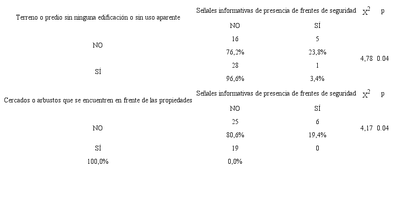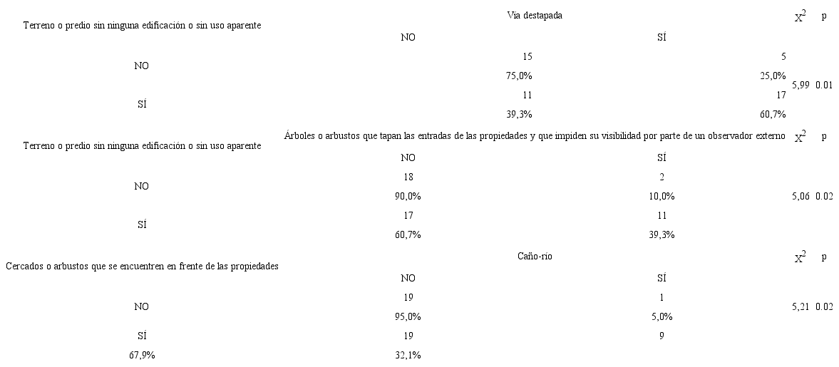 Las tablas 8 y 9 presentan las subescalas de características físicas de la escala de territorialidad, cuyas asociaciones resultaron estadísticamente significativas con otras subescalas. En consecuencia, al relacionar las características físicas de la escala de territorialidad con las de espacio defendible se halló que condiciones físicas tales como “terreno o predio sin ninguna edificación o sin uso aparente” y “cercados o arbustos que se encuentren en frente de las propiedades de la escala de territorialidad” se asociaban con “vía destapada”, “árboles o arbustos que tapan las entradas de las propiedades y que impiden su visibilidad por parte de un observador externo” y “caño-río”; ítems de la escala de espacio defendible, los cuales, de acuerdo con los estudios, disminuyen la percepción del delincuente de ser descubierto y, por lo tanto, favorecen la criminalidad (ver la tabla 8).