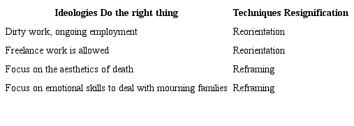 Following, techniques, ideologies and social practices of morticians and funeral directors in the fight against professional stigma are analyzed. To facilitate the understanding of the analysis, it was decided to rehash theoretical analytical definitions of techniques identified in the analysis of the interviews with funeral services workers.