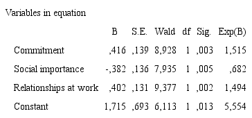 Data were reported with the chi-square test inherent to each of the comparisons performed; the separation point between a real difference and a non-real difference was a significance level of 5% or less. The following analysis scales remained in the logistic regression equation: social importance of the job, relationship with colleagues and commitment to the organization. The satisfaction scale was not left in the equation, but had significant Chi-square values.