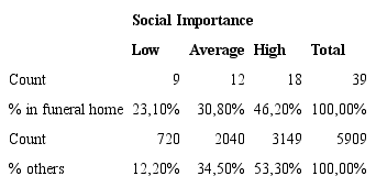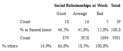 The quantitative research shows that workers consider that their job lacks social importance, that is, prestige. Table 4 indicates that 23,10% of funeral services workers deem that society does not care about their job. In the general group of workers, 12,20% have this perception.