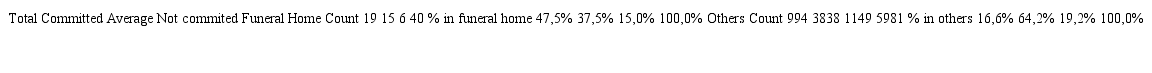 The more comprehensive research analyzed 6.546 workers of several professional categories. In the research about funeral services workers, 43 workers were analyzed. The professions studied, mortician and funeral director, are primarily masculine professions. For that reason, interviews included males. The average age of funeral services workers is 43 years of age (standard deviation 11,7; minimum: 20 years.; maximum: 75 years).