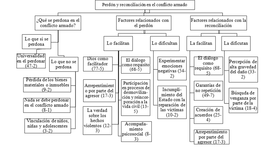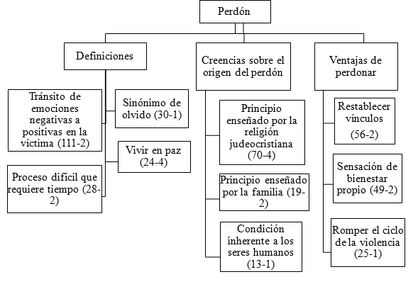 Durante el proceso de análisis de datos emergieron cinco categorías, nombradas de la siguiente manera: a) perdón, que hace referencia a la definición del perdón, las creencias sobre el origen del perdón, las ventajas de perdonar y los factores relacionados con este proceso; b) reconciliación, igualmente centrada en su definición y los factores que la facilitan; c) perdón y reconciliación en el conflicto armado, que hace referencia a lo que es posible perdonar en el conflicto armado y cuáles son las ideas asociadas al perdón y la reconciliación; d) justicia en el conflicto armado, es decir, creencias sobre esta, sus mecanismos y la relación entre perdón/reconciliación y justicia; y, finalmente, e) religión, categoría emergente centrada en la relación de la religión con el perdón, la reconciliación y la justicia. A continuación se presentan los contenidos de cada categoría a partir diagramas que recopilan las categorías de análisis y muestran su frecuencia de aparición en el discurso (número extremo izquierdo de cada categoría) y su relación con otras categorías (número extremo derecho de cada categoría).