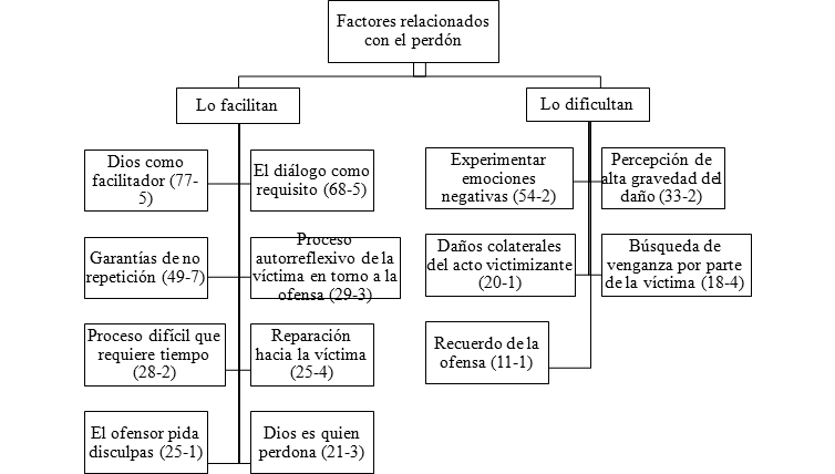 Por otro lado, en la figura 2 también se pueden ver los factores que dificultan el perdón, tales como experimentar emociones negativas y una percepción alta de la gravedad del daño, en cuanto a su irreparabilidad -“[…] daños que le hacen a uno que son irreparables […]”-, como la dimensión de la ofensa “[…] si fuera grande, es más, más difícil, más difícil […]”. También, los daños colaterales del acto victimizante, por ejemplo, perder estabilidad económica o tener que reconstruir un proyecto de vida en otro lugar de residencia, y el recuerdo de la ofensa pueden obstaculizar el proceso de perdón.