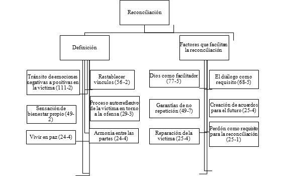En lo que respecta a la reconciliación, esta es definida como el tránsito de emociones negativas a positivas en la víctima, como se observa en la figura 3. Se encuentra que la reconciliación cumple la función de restablecer los vínculos anteriormente fragmentados, y también hace parte un proceso autorreflexivo de la víctima en torno a la ofensa. En segundo lugar, este término está relacionado con una sensación de bienestar propio, el vivir en paz -“[…] que haiga paz, será […]”- y tener armonía entre las partes, entendido como “[…] saber tratar a las personas, manejarse uno bien con las personas […]”.