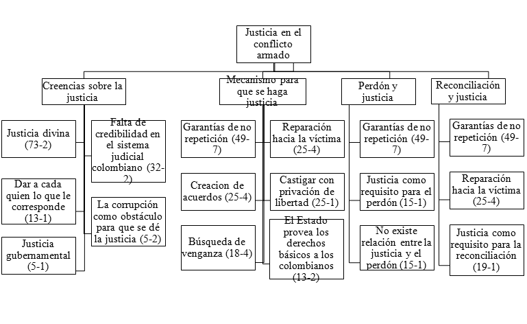 En relación con la categoría de justicia, para los participantes, esta es principalmente justicia divina (es decir, que sólo un Dios es quien puede castigar a quien ha cometido una ofensa). Lo anterior tiene relación con la poca credibilidad que tienen las víctimas en la justicia que provee el Estado, ya que se cree que los juicios a los que deben ser sometidos los victimarios nunca llegan, ni tampoco la reparación que se ha prometido, factor que complejiza la situación del desplazado. De este modo, no es posible creer en la justicia que ofrece el Estado, por lo que las víctimas acuden a sus creencias religiosas como esperanza para obtener justicia. Esto ha sido reseñado por otros estudios, como en los de Huyse (2003), y en Hill, Juola y Cohen (2007).