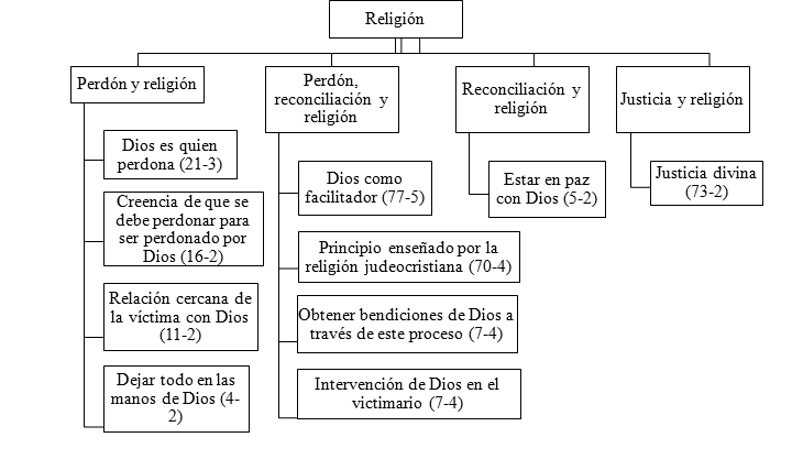 Finalmente, emerge la categoría religión -como se ve en la figura 6-, debido a la alta frecuencia con la que los participantes la mencionaron como parte fundamental del perdón, la reconciliación y la justicia. De este modo, la relación establecida entre perdón y religión tiene que ver con la creencia de que Dios es quien perdona. A su vez, existe una noción de reciprocidad: el ser humano debe perdonar para ser perdonado por Dios, y se establece también que el tener una relación cercana con Dios y dejarlo todo en manos de él -“[…] poner la situación en las manos de Dios […]”- facilita el perdón.