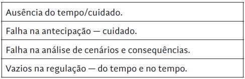Não é menos dramático quando em causa estão mortes simbólicas ou mortes que hão de registar-se; embora, quando acontecem, não seja possível relacioná-las com a ação política do presente e responsabilizar por esta. De forma sucinta, todos atos de descuido do tempo estão intrinsecamente relacionados com a ausência de antecipação e/ou excessiva projeção do passado sobre o futuro. Na tabela 8, apresentamos o que define uma política de cuidado do tempo multinível e que necessita, para a sua concretização, de detalhe específico através de guias ou códigos que respeitem cada área ou organização, de forma autónoma.
