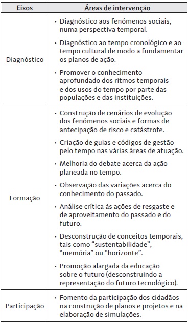 Nesta perspetiva, um primeiro nível de consciencialização sobre o tempo e a sua importância prende-se com as condições e competências da política para acautelar o modo como ela própria, pelo interesse que estabelece com a economia, provoca disjunções temporais, com fortes efeitos sociais e culturais, tal como se encontra mencionado na tabela 2.