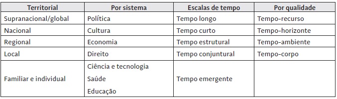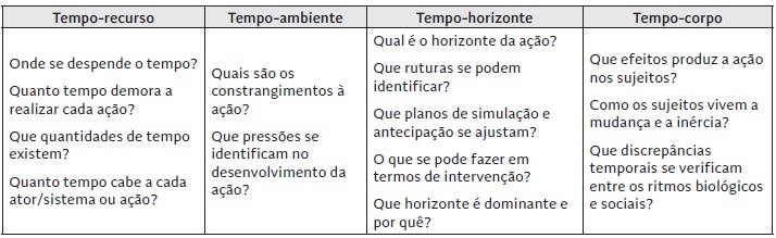 O tempo-recurso é essencial à definição da ação e remete para a qualidade do tempo enquanto objeto de apropriação de sujeitos, de instituições e dos governos. O tempo-ambiente define a qualidade do tempo como algo imposto, que se torna efetivo, embora seja invisível. É o tempo-contexto que impõe limitações à ação e que pode estar relacionado com o estado das situações em que se define ação. O tempo-horizonte define o sentido de orientação em relação ao passado, presente e futuro e é essencial na definição da ação e dos seus efeitos. O tempo-corpo define a qualidade do tempo como duração vivida e interiorizada, sentida. Inclui a dimensão subjetiva da vida e o modo como os sujeitos sociais expressam a sua situação no tempo.