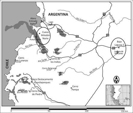 En cuanto al alero Pali Aike 2, se encuentra al SO del Campo Volcánico de Pali Aike (Chile). Según los datos publicados (Massone e Hidalgo 1981), el alero se ubica dentro del cráter de un volcán, y se han detectado dos sitios más en las proximidades. Presenta una gran visibilidad y su entorno es sumamente árido, sin presencia de agua, salvo lagunas temporales y una vegetación del tipo estepa magallánica seca. La capa 1 tiene un fechado aproximado de 220 AP. La materia prima dominante es el basalto, seguido por las rocas silíceas, la calcedonia y la obsidiana. El conjunto instrumental representa el 4,1% del total artefactual hallado en el sitio, y dominan los raspadores frontales pequeños, raspadores laterales de borde amplio, raederas y puntas pedunculadas, entre los más frecuentes. En menor proporción se hallaron también perforadores, cepillos, boleadoras (N=1) e instrumentos de muesca. Los desechos de talla representan el 94,9% de los artefactos y están compuestos en su mayoría por lascas, en mucha menor medida por láminas, y algunos núcleos. Esta capa tiene el mayor número de artefactos de todo el sitio. En cuanto a la arqueofauna, predominan el guanaco (Lama guanicoe), el choique (Rhea pennata), aves indeterminadas, cururo (Ctenomys spp) y zorrino (Mephitidae) (Massone e Hidalgo 1981).