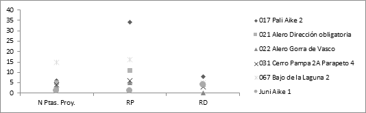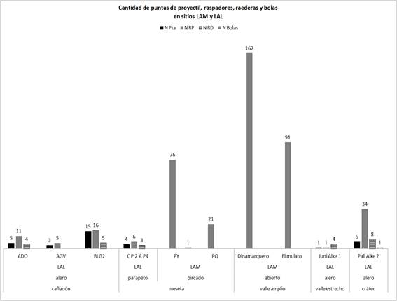 De esta manera, se propuso analizar comparativamente las frecuencias de puntas de proyectil, junto con dos tipos artefactuales: los raspadores y las raederas (Aschero 1975; 1983). El objetivo de tal comparación radicaba en comprender si existía una correlación entre la presencia de puntas de proyectil y la funcionalidad asignada a estos sitios, esperando una baja cantidad de raspadores y raederas en localidades de actividades limitadas (LAL) (Borrero 1987).