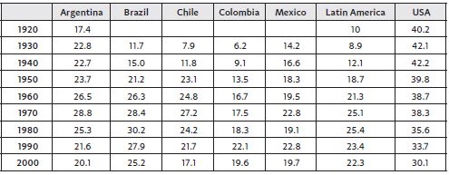The main policy instruments associated with ECLA developmentalism were exchange control (often manifest in multiple exchange rates that gave preference to the manufacturing sector), protectionism (non-tariff barriers to trade and exchange regulations were employed in conjunction with, sometime in preference to, discriminatory duties) and forced savings. Overvalued, but not necessarily stable, exchange rates prevailed for much of the period and were consistently applied to the advantage of the industrial sector. While only Mexico managed to defend a stable exchange rate throughout the classic period of ISI, the repeated devaluations that occurred elsewhere hardly benefited commodity producers as devaluations were accompanied by windfall taxes on exporters. This was consistent with cepalista trade theory which argued that markets for exports were not price responsive. Devaluation, followed by windfall taxes on exports, was also consistent with the regime of exchange and export profit ‘nationalisation’ and the distortion of the domestic terms of trade in favour of the urban industrial sector. As the principal source of foreign exchange, the export sector was consistently squeezed by state agencies. Inflation was the main, but not the exclusive, mechanism of forced savings. Having looted the social insurance funds (caixas) to finance the construction of the Volta Redonda iron and steel complex, regimes in Brazil and elsewhere learnt to milk -politically as well as economically- the social security system (Mesa-Lago 2008). As a growing proportion of the urban white-and blue-collar workforce was brought within the scope of the social insurance net and while the funds remained in surplus, they were an important source of forced saving (Mesa-Lago 1991, 186). The most sophisticated system of forced savings was devised in Brazil during the miracle years, a period of relatively low inflation when all formal sector workers were compelled to contribute to social insurance funds, the national housing bank (its resources were used to finance road building in Amazonia) and indexed individual savings accounts. Coupled with social repression and income concentration, mechanisms like inflation and social insurance ensured that by far the greater part of investment was financed by domestic savings in countries like Brazil (Suzigan & Villela 1997).