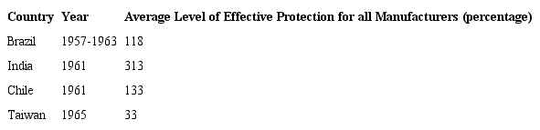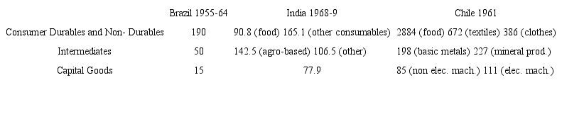 In protecting nascent firms, all three countries used a set of overlapping tools that resulted in very high effective levels of protection with very significant inter- and intra-sectoral variation. As Table 1 demonstrates, Brazil and Chile’s average levels of protection for manufacturers were over 100%, while in India they were over 300%. A comparison to Taiwan, which employed a milder ISI, highlights the extreme protection in the other three countries, ranging from more than three to roughly ten times Taiwanese levels.