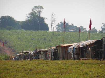 En el caso de las investigaciones relacionadas con las demandas por tierras en Brasil, el despliegue analítico mencionado, de las formas a los efectos, corresponde también a los desafíos que se nos fueron presentando en campo con la apertura a nuevos locus etnográficos, como son las retomadas de tierras y campamentos organizadas por colectivos indígenas Guaraní y Kaiowá del estado São Paulo y Mato Grosso del Sur.(3) Es necesario mencionar que las ocupaciones y los campamentos como formas de demanda y lucha por la tierra son estrategias más recientes entre colectivos indígenas, en comparación con trabajadores rurales sin tierra. En el caso de Brasil, desde poco antes del retorno democrático de 1984, las ocupaciones y los campamentos organizados por agricultores o campesinos sin tierra comenzaron a configurarse como un lenguaje de demanda, una “forma campamento”, como propone (Sigaud 2000), un lenguaje simbólico que fue legitimado por el propio Estado cuando, a finales de la década de 1970 e inicios de la década de 1980, realizó la distribución de lotes de tierra a las familias participantes en las primeras ocupaciones.(4) Así, establecer un campamento organizado por un movimiento se volvió la “forma” adecuada de “indicar” al Estado cuál era la tierra que se deseaba.(5) De esta manera, fue configurándose como lenguaje social y simbólico, entendido y compartido por participantes de los movimientos, por autoridades municipales y estatales y por representantes de los órganos del Estado encargados de las reparticiones de tierras. Los campamentos sin-tierra fueron adquiriendo características comunes: barracos,(6) lonas, banderas, movimientos sin-tierra y otras confederaciones campesinas, organizando las movilizaciones, pero también características propias que conformaron variaciones de ese lenguaje de demanda, como por ejemplo, el estatuto de dominio de la tierra (estatal o federal), la diversidad de personas y familias instaladas en los campamentos, que también reflejaba un perfil socioeconómico diverso, la relación establecida con las autoridades locales, los partidos y representantes del Estado, y los modos de circulación cotidiana de sus participantes y su relación con pueblos y ciudades cercanos.