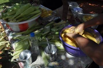 En las imágenes 2 y 3, tres vecinas de dos asentamientos diferentes se reúnen una tarde para la preparación de tamales que serían repartidos después entre sus familias del asentamiento y entre otros parientes y amigos de pueblos cercanos y otros más lejanos. Los elotes, que sirven de materia prima, oriundos del lote de una de ellas, se juntan con las manos de otras, con la plática, con las habilidades y con el cuidado y la consideración que este momento produce y que las vincula.