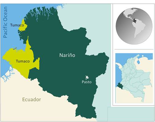 The Awa ethnic group, a population of around 37,000 inhabitants, is located in the department of Nariño in southwestern Colombia (see Figure 1). The area in which they have settled in the tropical rainforest of the Andean foothills is propitious for growing coca (the main asset of organized illegal armed groups) and has proven to be a strategic corridor for the transport of narcotics through the Pacific Ocean. The use of antipersonnel landmines by the guerrilla in the territory was a mechanism used to protect the illicit crops that the government has been trying to eradicate since the early 2000s. It is in this context that the main victimizing events against the Awa community occurred. In 2009, two massacres were perpetrated by the FARC guerrillas in their territory leading to their mass displacement. From the time of those events through to 2011, over fifty homicides, one more massacre and two other mass forced displacements were registered (ACNUR 2011). These events were added to the list of victimizations that the indigenous suffered, which also included crimes against sexual integrity and freedom, forced disappearance, forced recruitment of children and adolescents, and damage from landmines, unexploded ordnance, and improvised explosive devices, among others (ACIN 2017).
