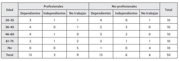 Todas las participantes han tenido alguna experiencia laboral en sus vidas. En el momento de las entrevistas, 16 de 25 profesionales y 19 de 25 no-profesionales trabajaban remuneradamente (70%). De la muestra, 25 trabajaban de manera asalariada, 10 trabajaban de manera independiente y 15 no trabajaban remuneradamente (ver la tabla 1).