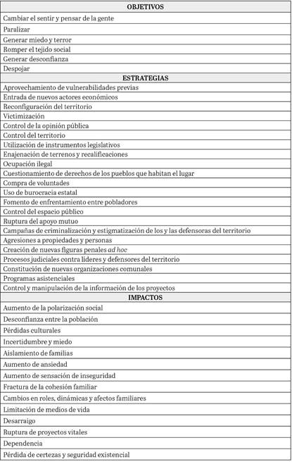 Antes de exponer el caso de la población garífuna en Honduras, se presenta la tabla 1 que resume los principales objetivos, estrategias e impactos que pueden conllevar el despojo y el desplazamiento forzado: