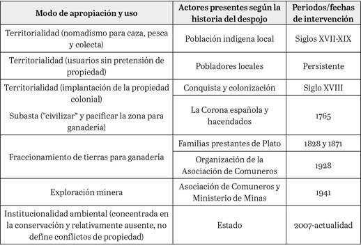 Se asume esta perspectiva desde la ecología política, según la cual el despojo progresivo es parte de las relaciones de poder típicas de la interacción ambiente-sociedad. En esta los grupos de poder captan los recursos mediante procesos de acaparamiento y generan disputas con poblaciones subalternas en procesos históricos de apropiación que se remontan a la Conquista y la Colonia (Alimonda 2011). La “persistencia histórica de ciertas formas de desigualdad constituye un escenario propicio para el despojo” (Vanegas y Caicedo 2017, 10), inserto en una dinámica global neoliberal que propicia estos escenarios en los territorios locales (Composto y Navarro 2014).