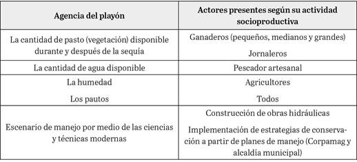 Si bien la agencia del playón puede variar de acuerdo con la actividad socioproductiva principal de los actores locales -puesto que realizan varias-, hay unas visiones sobre las cuales coinciden la mayoría de los usuarios locales: