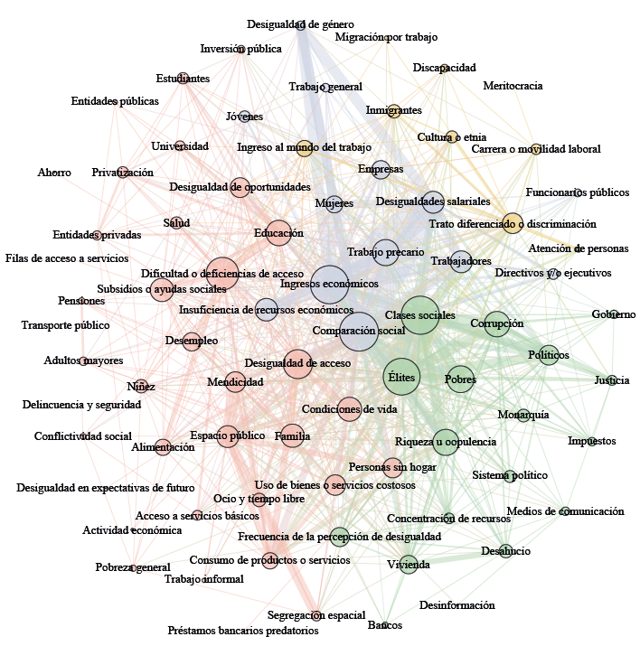Las categorías se agruparon en cuatro dimensiones. El primer grupo estuvo compuesto por el 46,75% del total de categorías y hace referencia a la desigualdad de oportunidades; el segundo grupo incluyó el 23,38% de las categorías y está relacionado con la desigualdad entre clases sociales; el tercero concentró el 16,88% de las categorías y concierne a la desigualdad de ingresos económicos y trabajo; y el cuarto bloque, compuesto por el 11,69% de categorías, giró en torno a la desigualdad entre grupos sociales específicos, tales como personas de etnia gitana, inmigrantes, personas en situación de discapacidad, u otros grupos discriminados o en riesgo de exclusión social. Estas dimensiones se identificaron de forma empírica con los análisis de redes y no son mutuamente excluyentes. Es decir, captan los patrones de asociación entre categorías, las cuales pueden estar relacionadas con otras -aunque en menor medida-. Las etiquetas de las categorías corresponden a la interpretación de los/as investigadores/as.