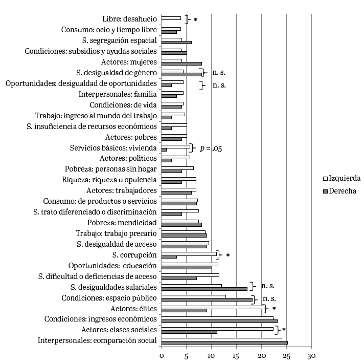 Los análisis exploratorios derivados de las pruebas de chi-cuadrado sugieren que las personas que se autoposicionaron a la izquierda del espectro político (vs. a la derecha) mencionaron en mayor medida temas como: clases sociales, 2(1,N = 488) = 6,23, p = 0,013; élites, 2(1,N = 488) = 6,97, p = 0,008; corrupción, 2(1,N = 488) = 5,95, p = 0,015; vivienda, 2(1,N = 488) = 3,79, p = 0,051; y desahucios, 2(1,N = 488) = 3,94, p = 0,047. En cuanto a las otras categorías, las percepciones de la desigualdad económica fueron semejantes para las personas en ambos lados del espectro político, así como para aquellas situadas en el centro (véanse la figura 2 y la tabla S5 del material suplementario en línea para las respuestas detalladas).