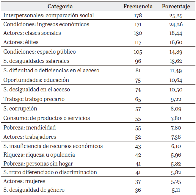 La frecuencia de aparición de las categorías permitió observar una amplia diversidad de temas relacionados con la forma de percibir la desigualdad económica en España. Como se puede observar en la tabla 1, el 25,25% de las respuestas señalaron la comparación social entre personas o grupos de personas, según la cantidad de recursos económicos entre grupos, su capacidad de consumo y la probabilidad de ser víctimas de prejuicio y discriminación. Esta comparación social consiste en referencias directas a grupos sociales (por ejemplo, jefes vs. trabajadores/as, hombres vs. mujeres), que se contrastan en función de sus (des)ventajas. Así, la desigualdad económica es percibida principalmente desde una perspectiva intergrupal, en cuanto a las condiciones materiales de vida, así como por la valoración social que tienen los grupos dentro de la sociedad.