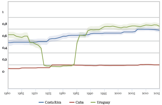 La política subnacional cubana ha sido un objeto de estudio complicado, incluso en su dimensión conceptual. La academia, los medios y organismos oficiales -y sus aliados internacionales- definen el régimen político insular como “democracia participativa” (Ríos 1996; García 2004; Valdés Paz 2009), mientras que el orden político estadocéntrico y regido por selectorados (Mesquita y Smith 2011) socializan visiones restringidas del acto de participar (Guach 2019). Alejada de la mejor tradición progresista (consejos obreros, autogestión, asambleas populares) o de las innovaciones democráticas contemporáneas (consejos gestores, contraloría social, mesas de concertación), en Cuba se priorizan formas de participación consultivas, territorialmente fragmentadas y temáticamente parroquiales, en las que participar se reduce al ejercicio individual de la voz, al emplazamiento a funcionarios de bajo y medio rango -con escasos ejemplos de remoción de representantes en los 43 años del llamado Poder Popular- y a la expresión limitada de demandas sobre bienes y servicios insatisfechos. Nunca se trata sobre asuntos de mayor calado político. Esta situación, acompañada de otros factores, explica sus bajos índices democráticos en contraste con naciones vecinas como Costa Rica y Uruguay, conforme muestran los estudios de V-Dem (2021) (ver gráfica 1).