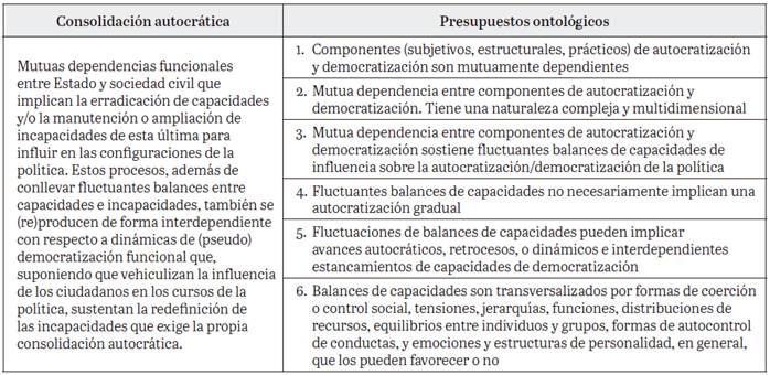 Consecuentemente con esa perspectiva epistemológica, el análisis que presento se sustenta en el concepto de consolidación autocrática, por considerar que se ajusta más claramente al caso cubano. No obstante, entiendo este concepto como relaciones de interdependencias (Elias 2008) entre formas de autocratización y democratización que (im)posibilitan capacidades para incidir en la configuración de la política. De esta manera, por consolidación autocrática asumo: las mutuas dependencias funcionales entre Estado y sociedad civil que implican la erradicación de capacidades y/o la manutención o ampliación de incapacidades de esta última para influir en las configuraciones de la política. Estos procesos, además de implicar fluctuantes balances entre capacidades e incapacidades, también se (re)producen de forma interdependiente con respecto a dinámicas de (pseudo)democratización funcional que, suponiendo que vehiculizan la influencia de los ciudadanos en los cursos de la política, sustentan la redefinición de las incapacidades que implica la propia consolidación autocrática.