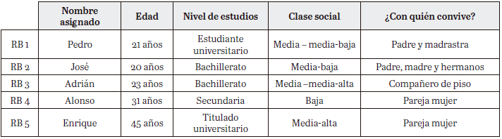El joven identificado como RB 1, al que llamaremos Pedro, tiene 21 años y es estudiante universitario. Es originario de Venezuela y vive actualmente con su padre y la pareja mujer de su padre en Valencia (España). Lo hemos tomado como un caso en el que su masculinidad evolucionó hacia un patrón de desafío de la masculinidad hegemónica que le condujo al momento actual en el que se ha autoidentificado como una persona de género no binario.