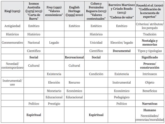 A modo de resumen introductorio, incluimos bajo estas líneas una tabla cronológica que incluye algunos de los valores-categorías e inspirada por Marta de la Torre (2013) (tabla 1). Estos valores se han elegido por su relevancia, a manera de síntesis; la última propuesta considerada es la reciente publicación del equipo del proyecto “La red de los valores del patrimonio”1 (Fouseki et al. 2020). Esta se basa en los resultados codificados de una encuesta reciente en la que se pidió a los expertos que aportaran su propia definición de valores patrimoniales; los conceptos más utilizados fueron significado, criterios y proceso, lo que denota una progresión hacia tipologías que se pueden definir como más dinámicas y que analizaremos más adelante en este trabajo.