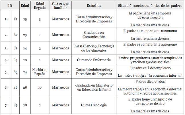 El enfoque metodológico de este estudio es de corte cualitativo y se desarrolla a partir de relatos de vida de siete jóvenes musulmanas de origen marroquí, con edades comprendidas entre los 18 y los 29 años. Se ha seleccionado la muestra en base a dos criterios; por un lado, que las jóvenes estén o hayan cursado estudios postobligatorios (estudios superiores), considerando el rol que juega el nivel educativo en la configuración de la identidad religiosa y; por otro, que las participantes presenten experiencias asociativas, al ser un factor clave en el proceso de resignificar su religiosidad. Con base en esto último, se observa un contexto asociativo orientado hacia la organización y generación de espacios de participación local, específicamente en las ciudades de Badalona y Santa Coloma de Gramenet (provincia de Barcelona), que contribuye a transformar su realidad y divulgar discursos a favor de la convivencia intercultural, la diversidad religiosa y la defensa de derechos de ciudadanía. Por último, si bien la muestra no es representativa en términos estadísticos, constituye un perfil pionero, objeto de todavía escasos estudios en el contexto español (Bertrán, Ponferrada y Pàmies 2016; Mendoza 2018; Mendoza, Bertrán y Pàmies 2021).