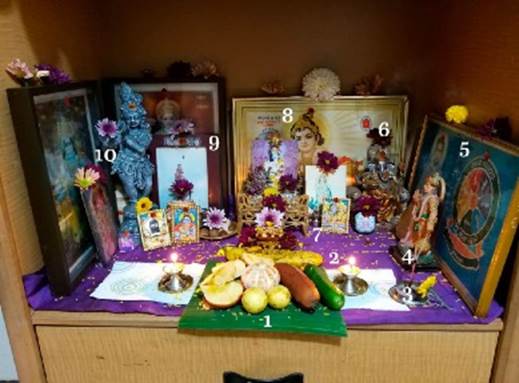 Debido a que la familia Kubal practica senderismo, colocaron flores que eligieron en los recorridos realizados por la ciudad para adaptar el altar. Este simple hecho permite incorporar concretamente el lugar de asentamiento en su altar (localizado en un mueble cerca de la sala) y, de esta manera, los ayuda a recordar que “Dios está en todas partes”. Entre los dioses que destacan en este altar, está el bebé Kṛṣṇa, quien se invoca para pedir protección y unión familiar, pues, para ellos, Kṛṣṇa funciona como el protector de los hijos. Además, uno de los colores que aluden a Kṛṣṇa es el morado, que por esto es dominante dentro del altar.