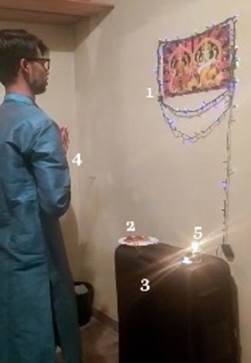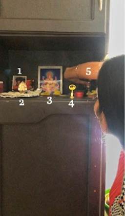 En el altar doméstico, los Patterjee usan solo una diya, pero sobre una plataforma como las mūrtis principales. Esta característica se puede identificar en los altares tanto domésticos como públicos de otro tipo de tradiciones religiosas, las cuales encienden velas o veladoras para llamar a sus divinidades (ver De la Torre y Salas 2020).