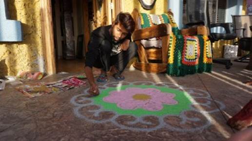 Como ya se mencionó, Mohnish Rao no llevó a México implementos necesarios para hacer el altar, por ejemplo, las mūrtis o estatuas de las divinidades; por ello, en Tijuana debió reemplazarlas por un póster de los dioses a los que venera. Él explica que en años anteriores, al no disponer de ninguna imagen para venerar, él mismo dibujó un raṅgolī19 con arena coloreada (imagen 4) y compró velas e incienso en una botánica en el centro de Tijuana. Tampoco pudo traer diyas para iluminar a los dioses, por lo que rodeó la imagen con luces de Navidad para despertarlos, las cuales también le sirven para decorar el altar. Además, según Mohnish, para adorar a los dioses la imagen debe colocarse orientada hacia el este y, en esta dirección, realizar la pūjā. Por este motivo puso la imagen en la parte superior de la pared, para hacer las oraciones de pie: “se cree que los dioses vienen a donde hay luz, por eso, como los queremos en todas las partes de la casa, ponemos velas o diyas de barro para iluminar todos los rincones y se deben dejar toda la noche ENT#091;…ENT#093; El altar siempre debe quedar orientado al este” (Mohnish Rao, empleado, noviembre de 2020).