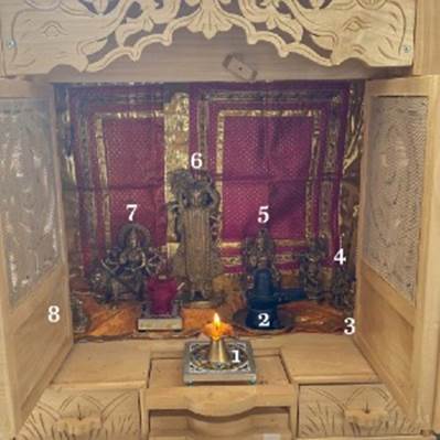 El mandir o templo es una caja de madera tallada a mano, fabricada con el propósito de realizar las adoraciones en casa (ver imagen 5). Esta caja está conformada por dos puertas y un par de compartimientos donde se guardan los accesorios necesarios para los rituales, por ejemplo, cerillos o mechas de algodón para la diya. Las puertas del mandir deben permanecer cerradas cuando no se está adorando a los dioses, pues al abrirlas se les despierta al exponerlos a la luz. Según el señor Patterjee, los dioses se ponen a dormir después de haberlos bañado, adorado y de haber limpiado el lugar de la pūjā.