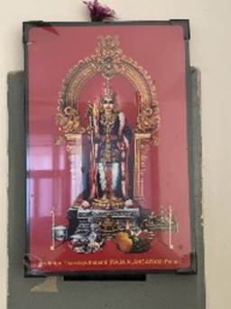La divinidad principal (imagen 7) se encuentra fuera del altar debido a su tamaño. La familia Sharma resolvió el problema colocándola junto al mueble del altar, sobre la caja de interruptores eléctricos. Así, al momento de hacer la iluminación de las deidades o āratī, el movimiento de la lámpara sale del espacio dedicado a las otras divinidades, las cuales se encuentran en el altar de la gaveta. De este modo, el espacio sagrado, o el que funciona como minitemplo, se expande a la cocina.