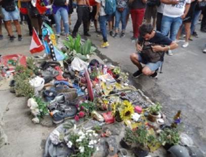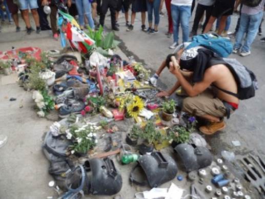 Se advirtió, asimismo, que la instalación de la animita en pleno centro de Santiago y el cuidado que esta recibió durante varias semanas revelan la existencia de una práctica religiosa fuertemente arraigada en la sociedad chilena y que se expresa con mayor intensidad en sectores sociales, culturales y económicamente subordinados. La animita ocupa, por lo mismo, un espacio importante dentro del campo religioso nacional y regional, y sobre todo pone de manifiesto que los lugares potencialmente religiosos o trascendentes pueden desbordar los límites de las instituciones y situarse en la experiencia cotidiana (Da Costa, Pereira Arena y Brusoni 2019). En este caso, quienes diariamente acudían a la animita, no lo hacían para adornar un monumento, sino para penetrar en un espacio de trascendencia y compartir con Mauricio Fredes sus dolores y esperanzas, expresarle su cariño, y decirle que ni su nombre será dejado en el olvido ni su rostro será borrado de la historia que escriben los pueblos. Bajo esa promesa, le pedían a Mauricio que siguiera presente, que los acompañara en la lucha, y que les brindara su protección y cuidado ante la violencia policial a la cual se exponían diariamente al salir a las calles a protestar.