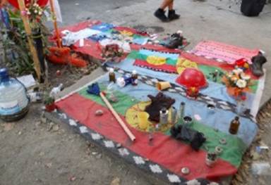Ahora bien, los practicantes de la animita de Mauricio Fredes no solo colocan objetos en ella, sino también líquidos y alimentos, como cervezas y panes, que son los más recurrentes. Al ver a un joven inclinarse y dejar en la animita una cerveza, le preguntamos por qué lo hacía. Su respuesta fue inmediata y con voz segura: “Es para que nos dé fuerza y nos cuide en la lucha… para seguir peleando contra estos asesinos [refiriéndose a la policía militarizada chilena]” (hombre, 10 de enero de 2020).