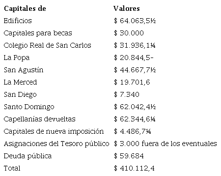 Además, la Universidad percibía rentas de más de 350 propiedades pequeñas que hacían parte de un capital de $ 30.000 pesos recibidos para becas entregadas por una donación, al igual que del antiguo Colegio de San Carlos, de las rentas percibidas de los conventos de la Popa, de San Agustín, de la Merced, de San Diego y Santo Domingo que, en conjunto, ascendían a $ 186.53 pesos. A ellos se sumaban, por concepto de capellanías devueltas, $ 62.344, 6¼ pesos y, de nueva imposición, otros $ 4.486,7¼. En total, como se aprecia en el cuadro, si incluimos las asignaciones del tesoro público (que eran las más bajas) y las que la Universidad asumía por concepto de deuda pública, las rentas de la universidad alcanzaban los $ 410.112,4 pesos11. Esta cifra era el resultado, también, de los réditos obtenidos de las casas, solares, fincas, huertas, haciendas y tierras que poseía ese centro educativo, ubicadas no solo en la ciudad de Cartagena, sino asimismo en las zonas rurales, las islas, la bahía, la playa de Chambacú e incluso en villas como la de Tolú o en la jurisdicción de Chiriguaná, entre otras12 (ver tabla 1).