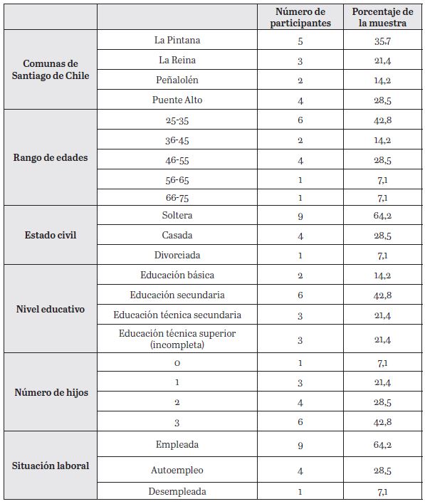 La unidad de análisis estuvo compuesta por 14 hogares populares de jefatura de hogar femenina, encabezados por mujeres entre 25 y 69 años de edad y con hijos a cargo. Nos referimos a mujeres populares en tanto buscamos tensionar las categorías de exclusión, marginalidad y pobreza utilizadas regularmente en las ciencias sociales, para reconocer la capacidad que ellas tienen de desarrollar estrategias de aprovisionamiento para sostener la vida en contextos de alta incertidumbre económica (Gago 2014; Castronovo 2018). Las participantes fueron reclutadas a través de servicios sociales, organizaciones sin fines de lucro y centros comunitarios. En la tabla 1 se detallan sus características demográficas. El 64 % tenían un trabajo remunerado y casi el 30 % eran trabajadoras independientes. Con respecto a su nivel educativo, la mayoría tenía educación técnica finalizada.