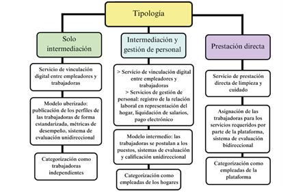 En suma, los aportes de la literatura sobre el tema revelan que los tipos de intervención de las plataformas de trabajo doméstico y de cuidados son heterogéneos, y que su caracterización resulta relevante para comprender su rol en el acceso a condiciones de trabajo decente, cuestión que conforma una de las principales preocupaciones en este sector. Teniendo en cuenta este objetivo -y con base en las contribuciones de la bibliografía internacional y regional-, se construirá una tipología para dar cuenta de las distintas formas de intermediación que pueden adoptar las plataformas en América Latina.