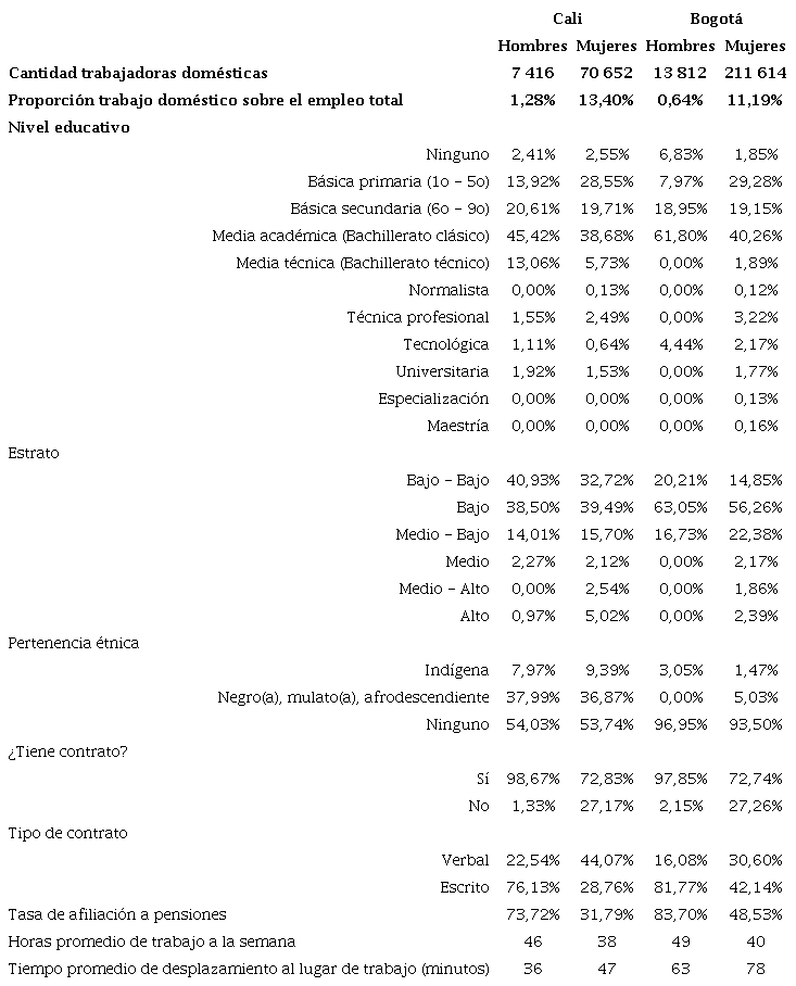 A pesar de este avance legislativo en los últimos años, la realidad es que la mayor parte del trabajo doméstico se mantiene en la informalidad o sin registro para el pago de la seguridad social. Según la Gran Encuesta Integrada de Hogares (GEIH) del DANE de 2022, en Colombia 604 000 mujeres y 45 000 hombres (generalmente jardineros o conductores) se dedicaban al trabajo doméstico remunerado. El 75,5% tenía entre 30 y 59 años, el 48,5% tenía educación inferior al promedio, el 64% vivía en estratos bajos y el 18,4% en estratos medio-bajos; además, el 43,9% eran cabezas de hogar. Sin embargo, las condiciones laborales eran desafiantes: solo el 20,5% tenía un contrato escrito; el 70% no tenía afiliación a fondos de pensiones (principal índice de informalidad); el 43,7% trabajaba menos de 48 horas semanales; y el 58,5% ganaba menos de un salario mínimo. En tanto que este estudio se enfoca en dos de las ciudades principales de Colombia, la tabla 1 describe las características de las trabajadoras domésticas en Cali y Bogotá.