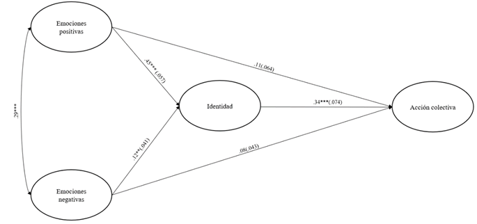 Igualmente, en el caso de Chile se encontró que la identidad mediaba la relación entre las emociones positivas y la acción colectiva (β = .476, b = .183, SE = .024, 95% CI [.139; .232], p = .004) y entre las emociones negativas y la acción colectiva (β = .119, b = .054, SE = .013, 95% CI [.030; .082], p = .004). La identidad también explica la mayor parte del efecto total en ambas situaciones (emociones positivas: β = .609, SE = .043, p = .004; emociones negativas: β = .205, SE = .043, p = .004) (ver Figura 2).