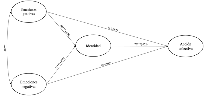 Con relación al efecto indirecto de la identidad en el modelo SEM, se encontró que la identidad social media la relación entre las emociones positivas y negativas, y la acción colectiva (Figuras 1 y 2). Este hallazgo coincide con los resultados del modelo EMSICA, el cual resalta el papel de la identidad social como mediadora entre determinadas variables, en este caso, las emociones positivas y negativas y la acción colectiva (Thomas, Mavor y McGarty 2012). Las emociones negativas y, en particular, las positivas que generan una determinada situación tendrán una mayor influencia en la acción colectiva, si quienes experimentan estas emociones se autoperciben como parte de un determinado grupo social.