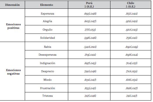 El modelo de dos dimensiones (emociones positivas y negativas) de diez elementos (Tabla 1) tuvo un ajuste aceptable en Chile (x2/df = 8.49, CFI = .916, RMSEA = .112, SRMR = .080) y en Perú (x2/df = 5.37, CFI = .925, RMSEA = .086, SRMR = .071). Las cargas factoriales de ambos países son aceptables, al punto de corte λ > .30 (Ventura-León 2019).