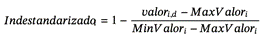 Donde valori,d es el valor original del indicador i en el territorio d, en este caso, la localidad a analizar; MaxValori es el valor más alto que el indicador i tiene entre todos los territorios y MinValori el valor más bajo del indicador i entre todos los territorios. No fue necesaria la estandarización para los indicadores de existencia de conflictos medioambientales, ya que la variable toma valores de 1, si existe un tipo de conflicto en el territorio, y de 0 si no hay presencia de este conflicto. En consecuencia, luego de la interpretación, se tiene que el valor de todos los indicadores está entre 0 y 1 -valores más cercanos a 0 indican bajo rendimiento y valores más cercanos a 1 indican mejor rendimiento-.