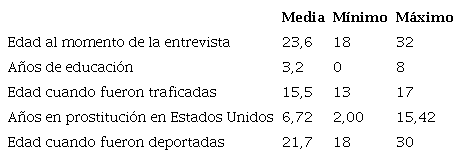 En total se entrevistaron 77 mujeres migrantes centroamericanas en tránsito por México, que durante su niñez fueron transportadas a Estados Unidos por redes de tráfico para la prostitución. Esta muestra no es representativa de las experiencias de todas las NNA traficadas de Centroamérica a Estados Unidos para el comercio sexual, ya que recoge únicamente discursos del segmento poblacional más vulnerable. La muestra la conforman 35 guatemaltecas, 21 hondureñas, 19 salvadoreñas y dos nicaragüenses, quienes al momento de la entrevista tenían entre 18 y 32 años, pero que fueron traficadas a Estados Unidos para el comercio sexual cuando tenían entre 13 y 17. Todas ejercieron la prostitución durante un promedio de 6,72 años, hasta que fueron deportadas a sus países de origen. Las entrevistadas fueron detenidas por agentes migratorios, casi siempre después de una redada en un local nocturno. El delito imputado fue el de encontrarse en Estados Unidos sin documentos, además de estar realizando una actividad ilegal (véase las tablas 1 y 2).